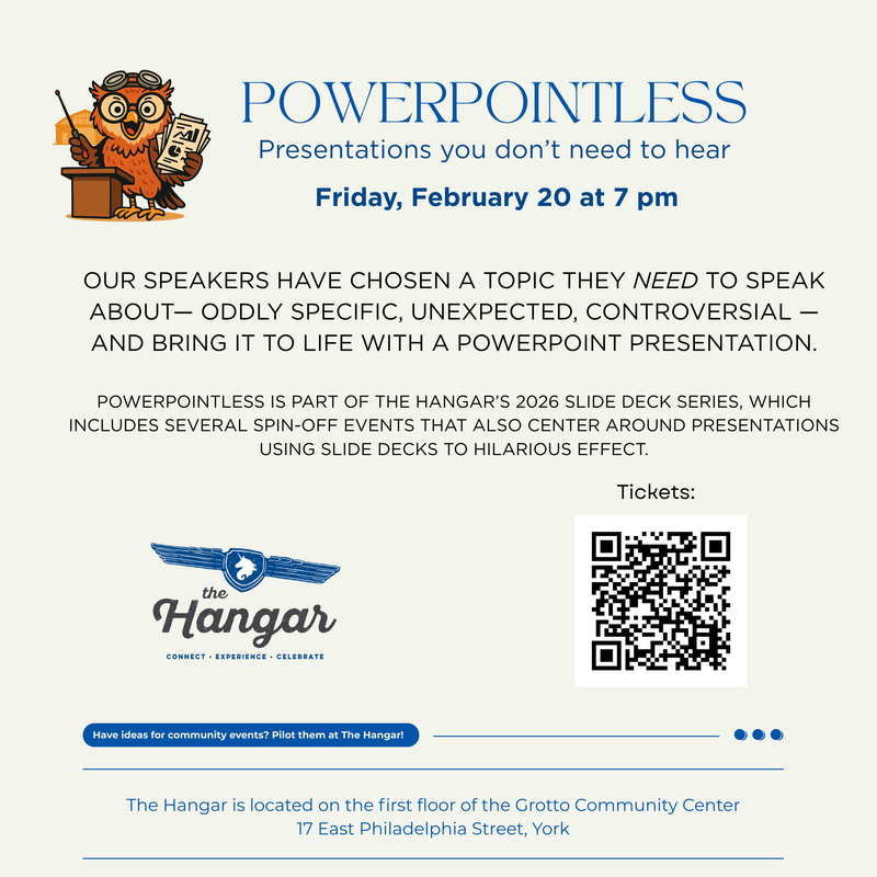 Location: The Hangar at The Grotto Community Center - 17 E Philadelphia St. York PA 17401